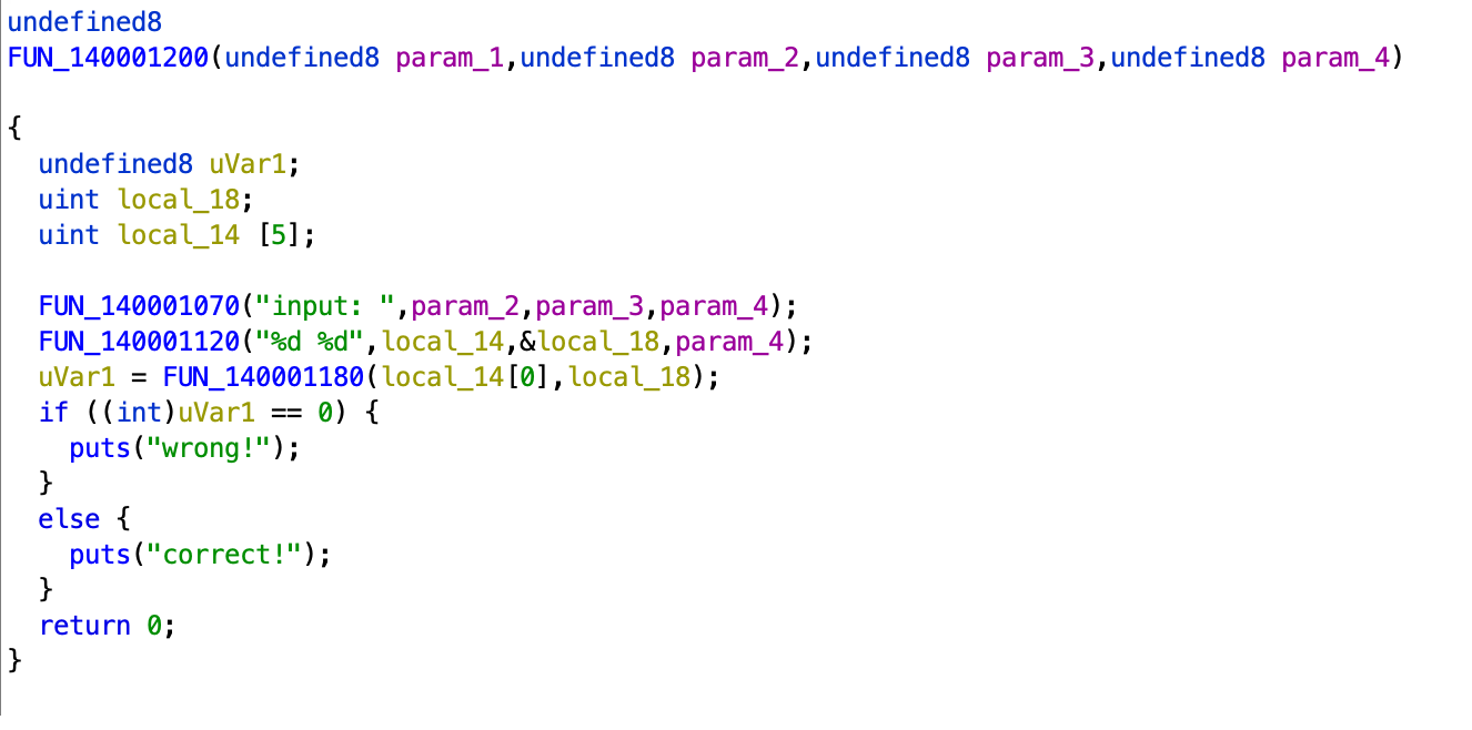 위의 함수에서 input: 이라는 문자열 출력 후 사용자로부터 %d %d 형태로 입력을 받은 후, 이의 값에 따라 wrong!과 correct!를 출력하는걸로 보이는데,,,,그럼 이게 main 함수이지 않을까 싶다! 그렇다면! 대충 우리가 현재 알고있는 함수로 찍어보자!