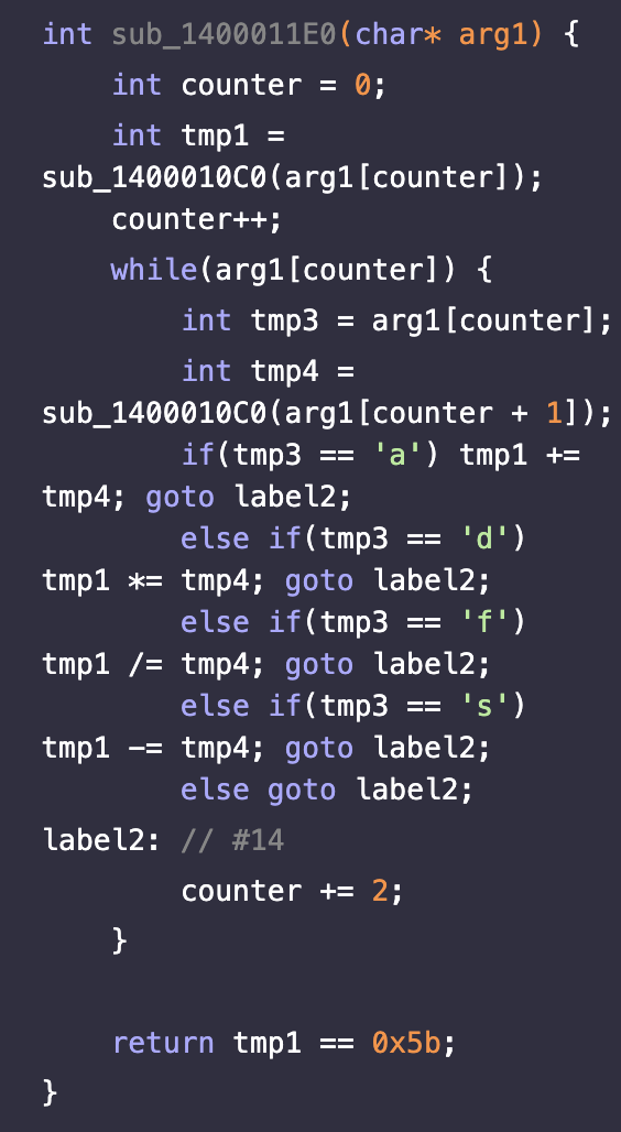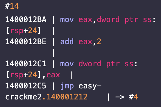 위의 분기문에서 최종적으로 오게되는 #14다. counter변수가 저장되는 rsp+24의 값에 2를 더한다. 이후 #4로 점프합니다. 허우허우 이렇게 생각해본 함수의 흐름을 C코드로 정리해보면 아래와 같을 것이다.(이렇게 바꿀 수 있다는 사실에 깜짞깜짝 놀란다..)