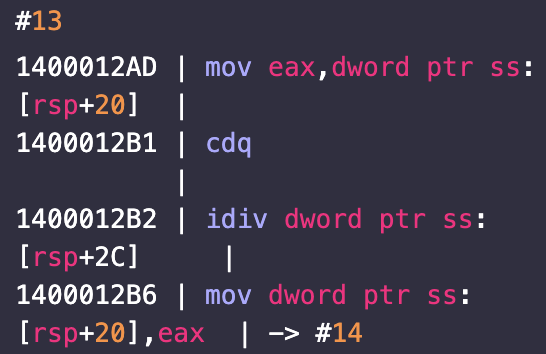 tmp5가 's'일때 오게 되는 부분이다. 이번에는 rsp+20 = [rsp+20] / [rsp+2C]을 진행하고 #14로 이동한다.