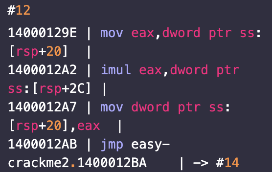 tmp5가 'f'일때 오게 되는 부분이다. 이번에는 rsp+20 = [rsp+20] * tmp5이다. 다시 #14로 이동