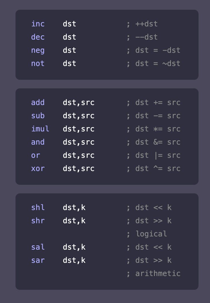 추가설명할게 있다면 shl,shr과 sal,sar은 모두 똑같은 Shift Instructions이지만 차이점이 있다. shl,shr은 logical shift이므로 이동하며 생긴 빈 bit 자리에는 0이 채워지는 반면, sal과 sar은 arithmetic shift이기 때문에 부호가 보전된다. 따라서 부호를 나타내는 최상위비트가 shift이후에도 보전됩니다.