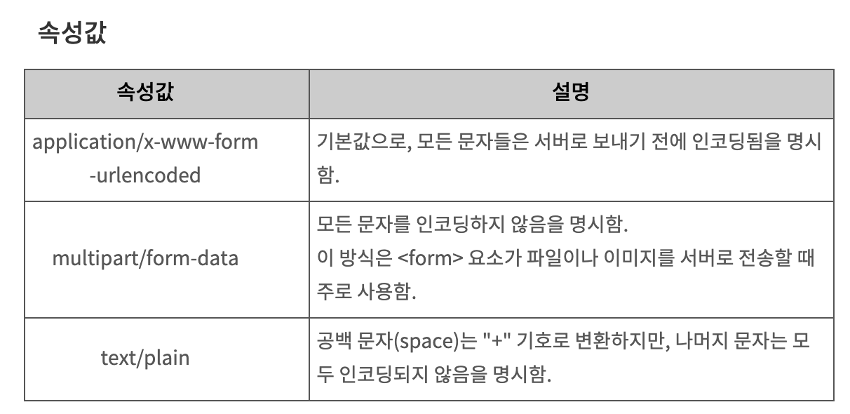 일단 post 방식으로 전해지고~ enctype 속성은 폼 데이터(form data)가 서버로 제출될 때 해당 데이터가 인코딩되는 방법을 명시한다!