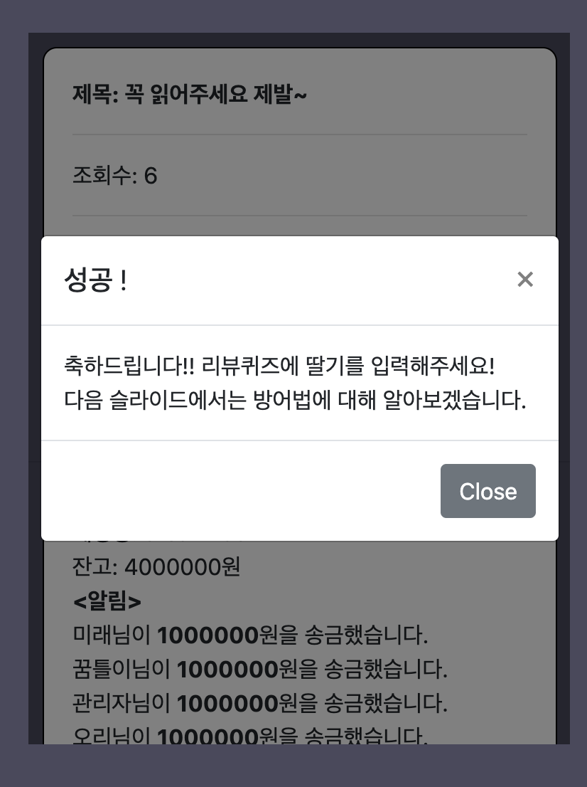 쪼기 밑에 보면 이 글을 클릭한 사용자들이 자기도 모르게 dreamhack의 계정으로 돈을 송금하고 있다..!무섭다