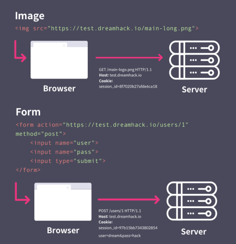 CSRF - 웹 브라우저는 기본적으로 Same-Origin-Policy(흠,,그냥 보안정책 중 하나, 다른 오리진의 리소스를 요청하거나 상호작용하는 것 금지)에 위반되지 않는 모든 요청에 쿠키를 함께 전송한당. 이때 비정상적으로 사용자의 의도와 무관하게 다른 사이트에 HTTP 요청을 보내는것을!? CSRF 공격이라고 한다.