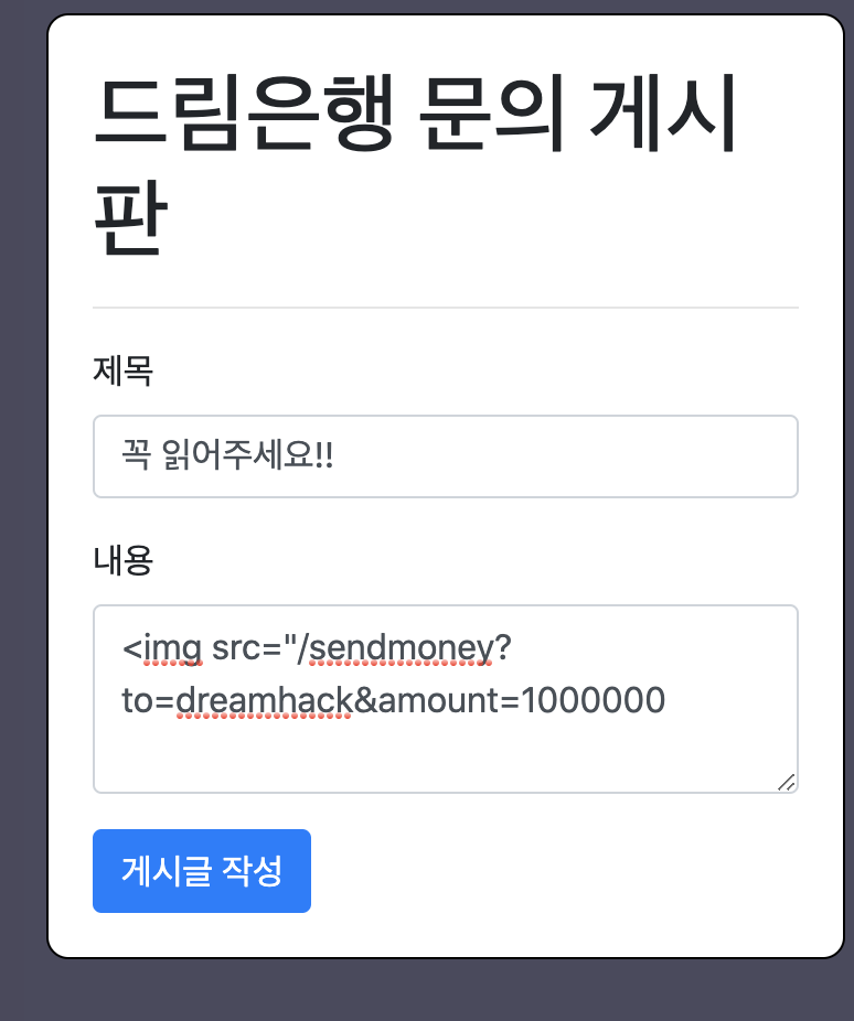 이렇게 게시물을 작성하면 사용자가 저 게시물을 클릭했을때! 자기도 모르게 dreamhack의 계좌로 1000000원이 송금될것같다. 후 해보자!!