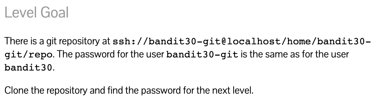 Level Goal There is a git repository at ssh://bandit30-git@localhost/home/bandit30-git/repo. The password for the user bandit30-git is the same as for the user bandit30. Clone the repository and..