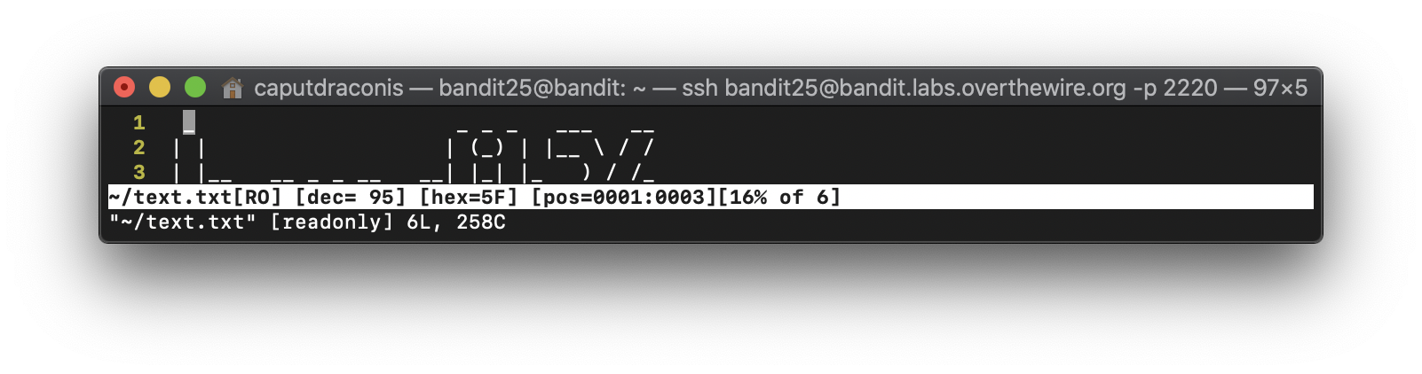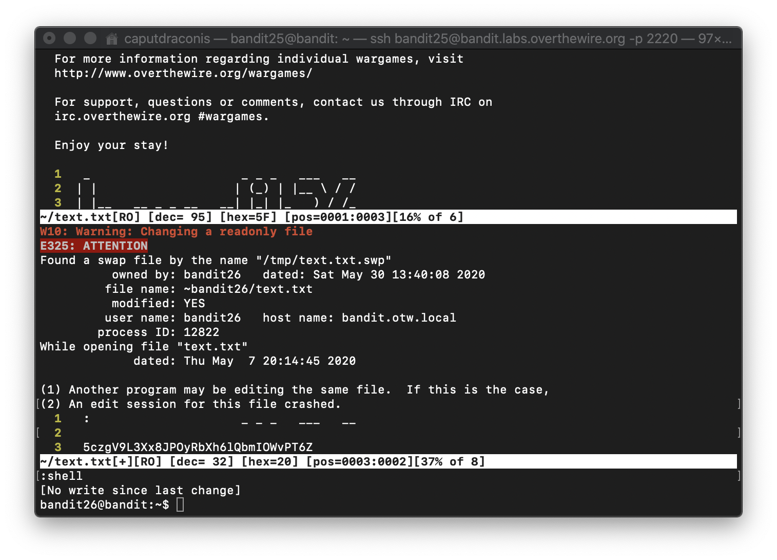 확인해본 결과 역시나 bandit26에게는 열람 권한이 없었고 이 프로그램을 이용해서 훔쳐봐보자