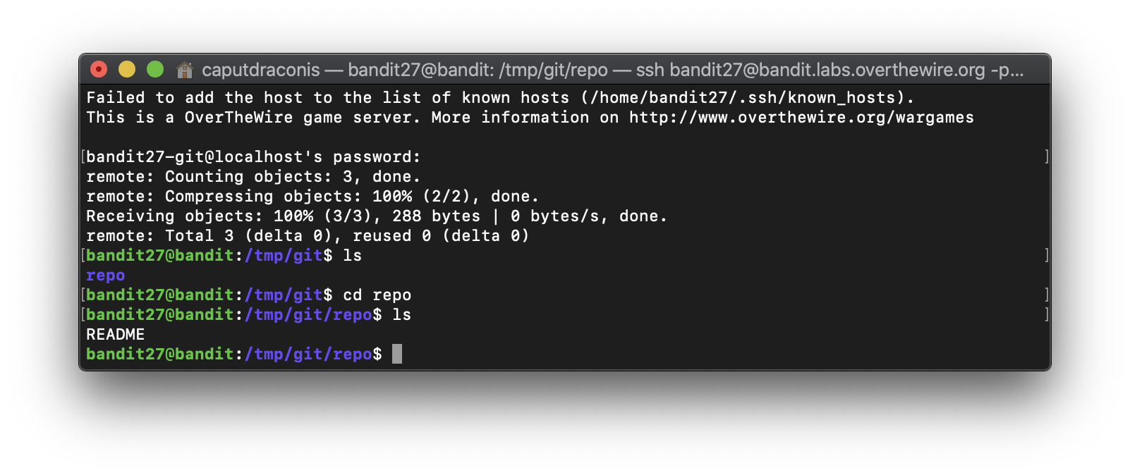 Level Goal There is a git repository at ssh://bandit28-git@localhost/home/bandit28-git/repo. The password for the user bandit28-git is the same as for the user bandit28. Clone the repository and..