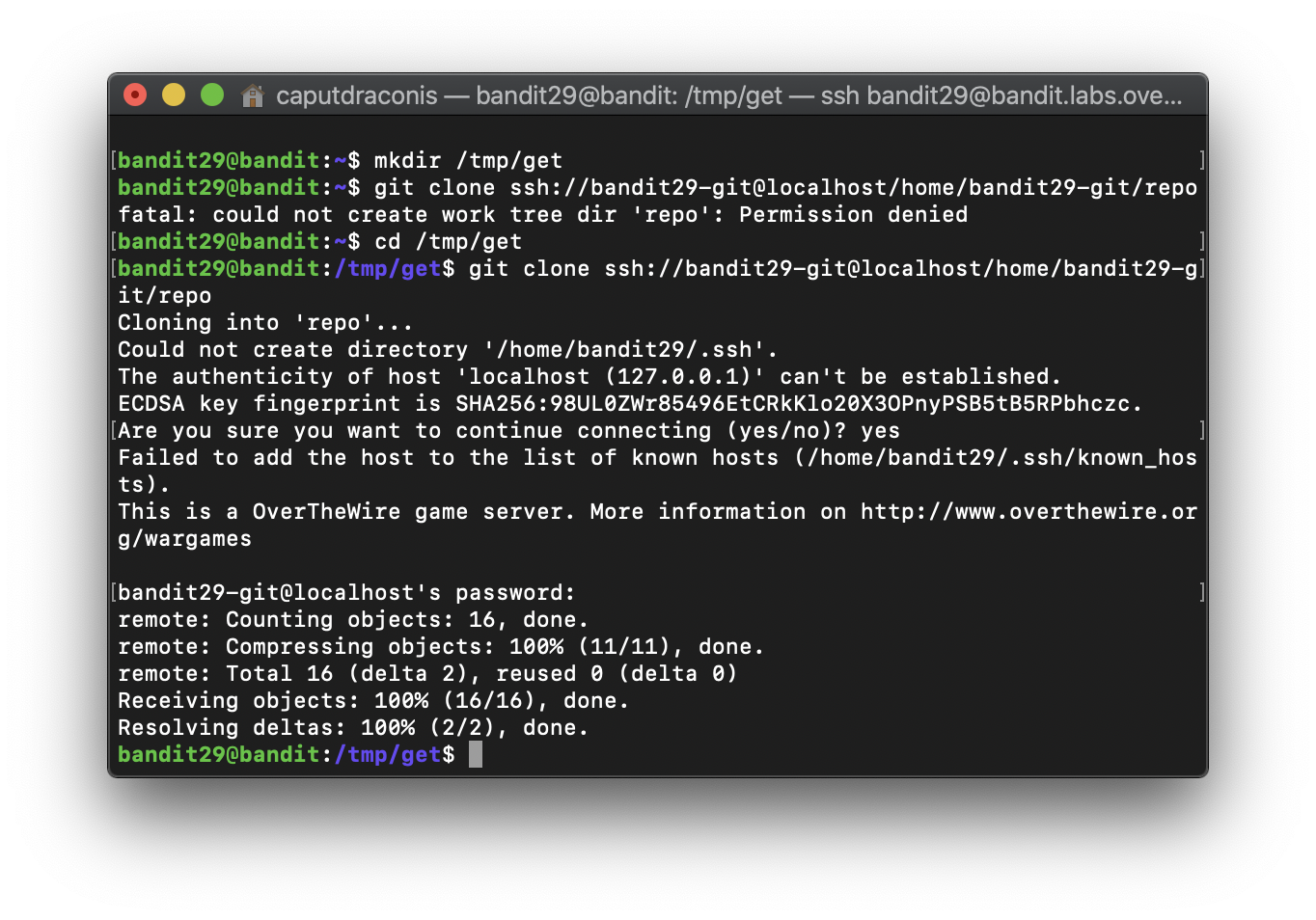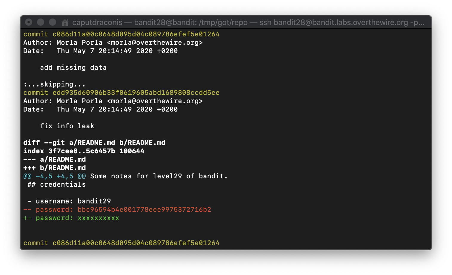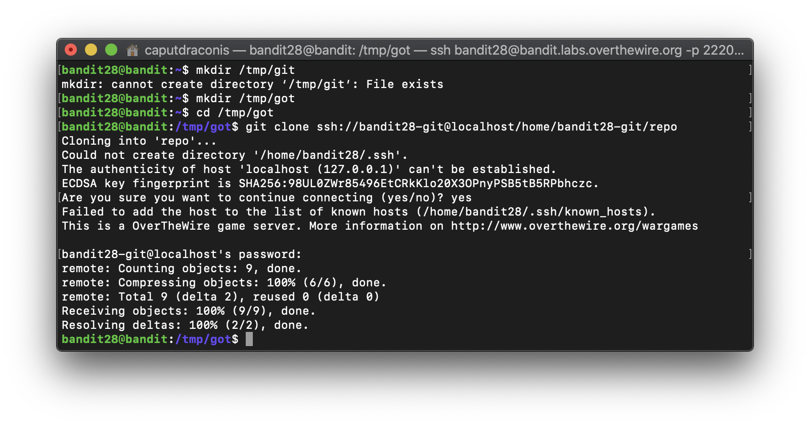 Level Goal There is a git repository at ssh://bandit28-git@localhost/home/bandit28-git/repo. The password for the user bandit28-git is the same as for the user bandit28. Clone the repository and..