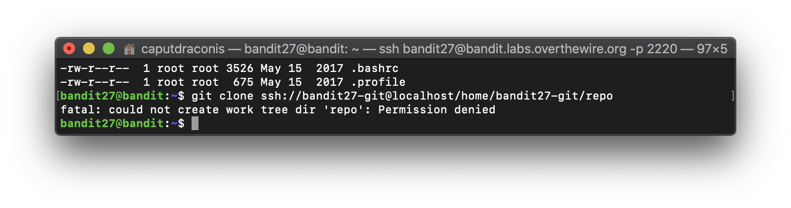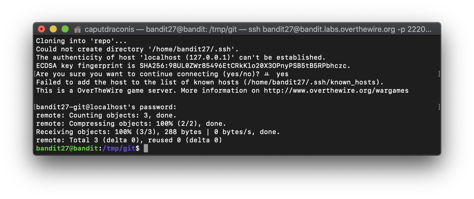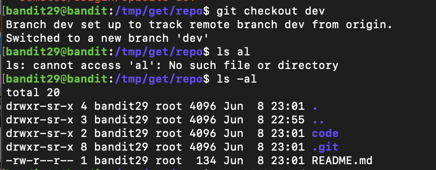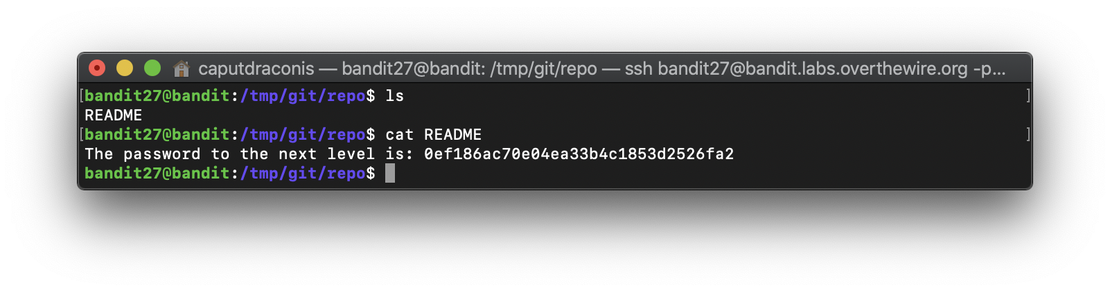 Level Goal There is a git repository at ssh://bandit28-git@localhost/home/bandit28-git/repo. The password for the user bandit28-git is the same as for the user bandit28. Clone the repository and..