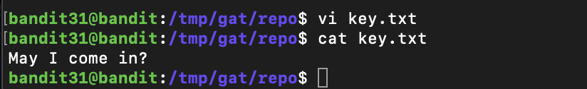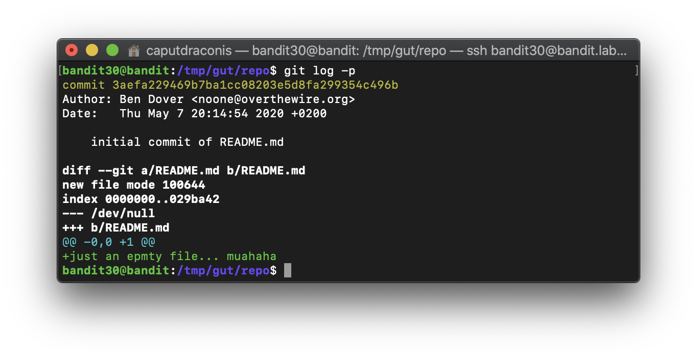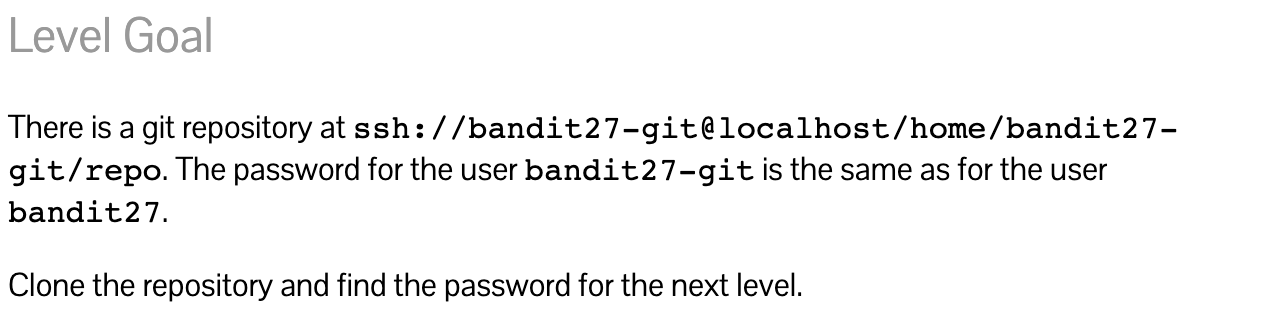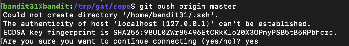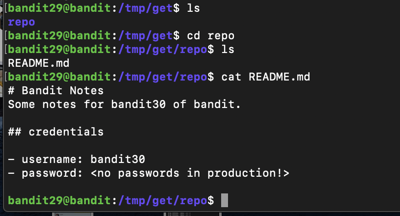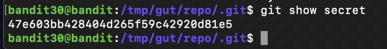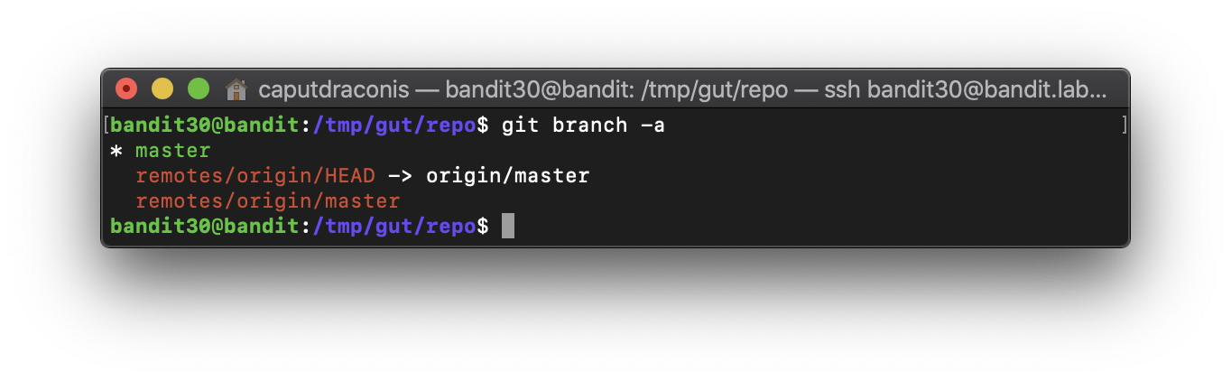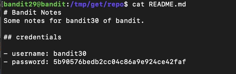 Level Goal There is a git repository at ssh://bandit30-git@localhost/home/bandit30-git/repo. The password for the user bandit30-git is the same as for the user bandit30. Clone the repository and..