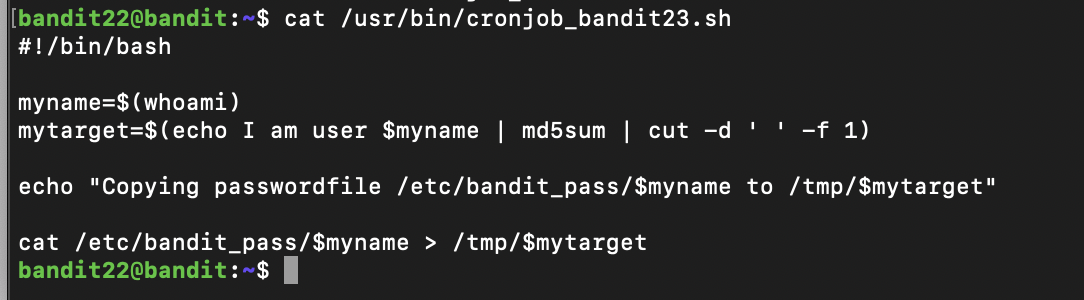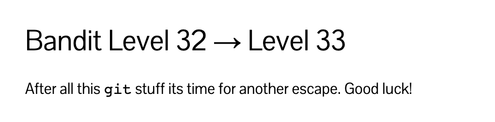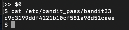 위의 사진처럼 $0을 입력하면 bash 쉘로 바뀜으로써 bandit33의 권한을 갖게 된다. 그렇기에 bandit33의 password에 접근할 수 있고 이를 출력하면1?