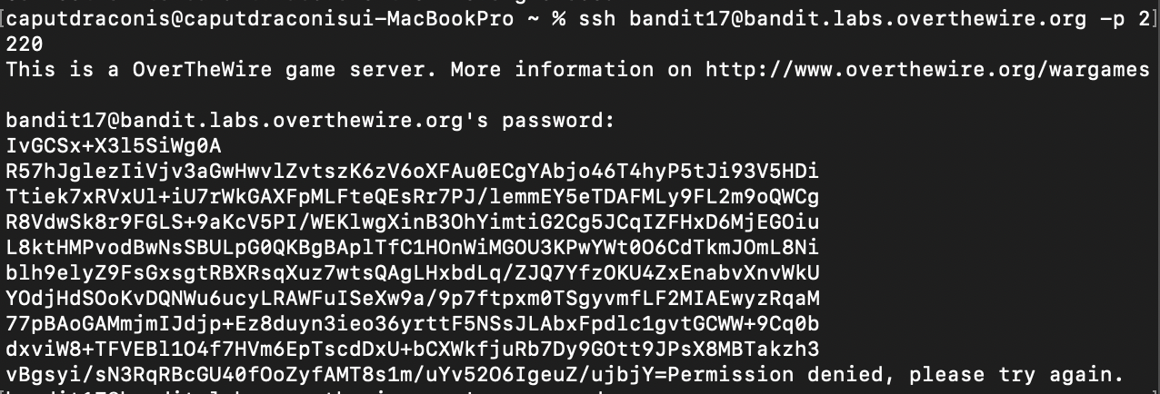 이렇게 권한을 변경하고 다시 ssh 명령어를 이용해 bandit17에 로그인해보자