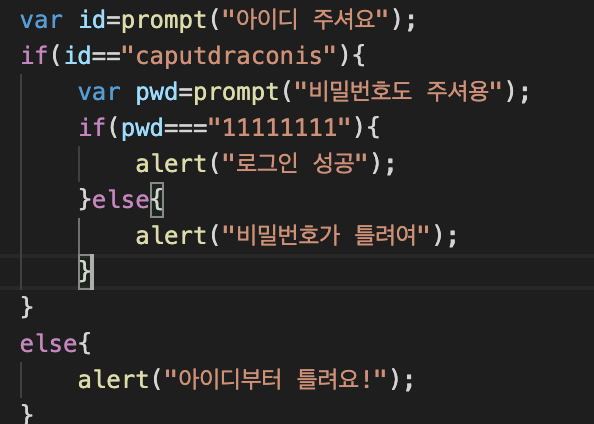 논리연산자 &&을 사용해 아까 구현했던 로그인 코드를 더 간단하게 했당. id가 caputdraconis 이며 pwd가 11111111여야!?로그인 성공이 alert된다.