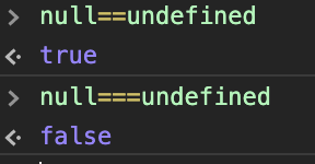 null과 undefined는 의미는 값이 없다는 의미에서 비슷하지만, null은 값이 없음을 명시적으로 표시한 것이고, undefined는 그냥 값이 없는 상태라는 점에서 조금 차이가 있다. 그래서 ===를 사용하여 비교하였을때 false가 나온다.