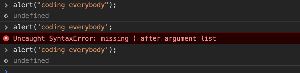 1. 사용하고 싶은 따옴표의 종류와 다른 따옴표를 문자열을 감쌀 때 사용한다. ex) alert("건탁's 수많은 과제들");