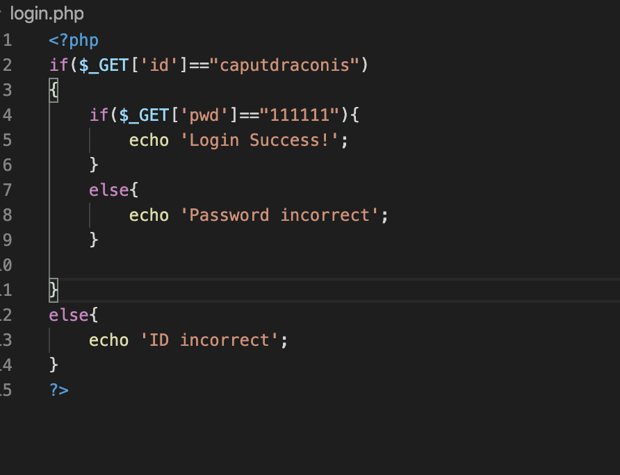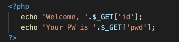 URL로 전송된 데이터를 받을 수 있다. 위의 코드는 localhost/~~/num.php?id=caputdraconis&pwd=1234라는 주소로 접속했을시
