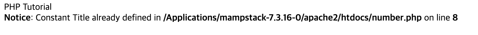 위의 코드를 실행하면 'Title'이라는 이름에 'PHP Tutorial'이라는 값이 상수로 저장된다. 이 상태에서 echo Title을 하면 PHP Tutorial이 실행되는걸 알 수 있다. 이후에 Title에 다른 값인 'CSS Tutorial'을 대입하려하자 Constant 뭐시기 하면서 오류가 뜨는걸 볼 수 있다.
