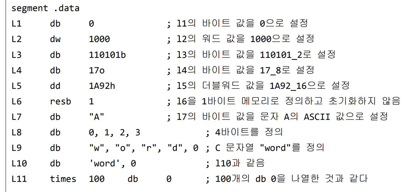 메모리 단위로는 word = 2 바이트, double word = 4 바이트, quad word = 8 바이트, paragraph = 16 바이트 . 메모리의 모든 데이터는 숫자로 되어 있다.