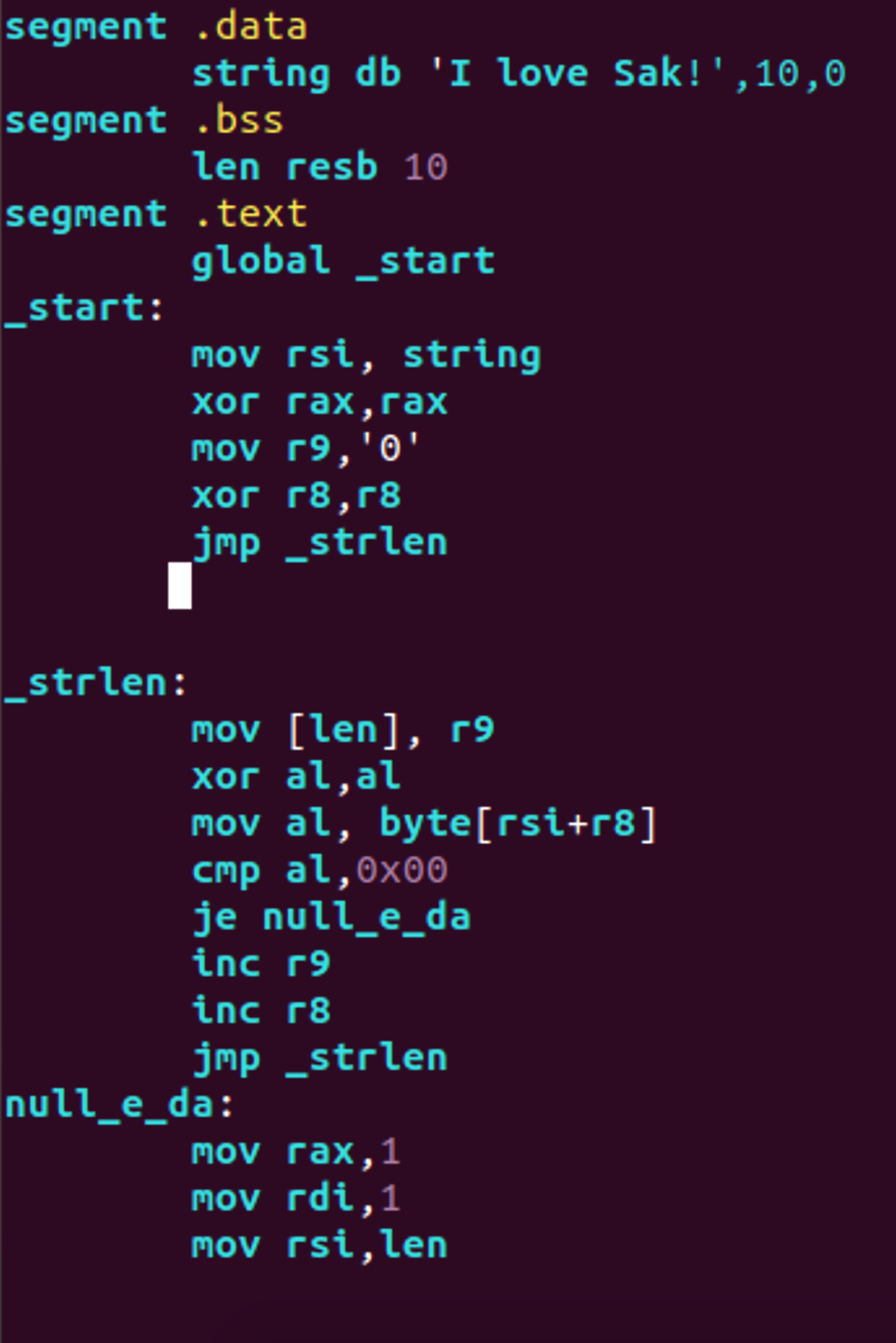 | jmp _strlen_next | 다시 _strlen_next로 복귀함으로서 비교 진행 |
