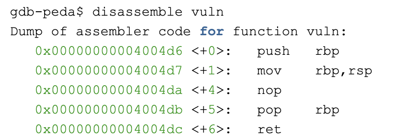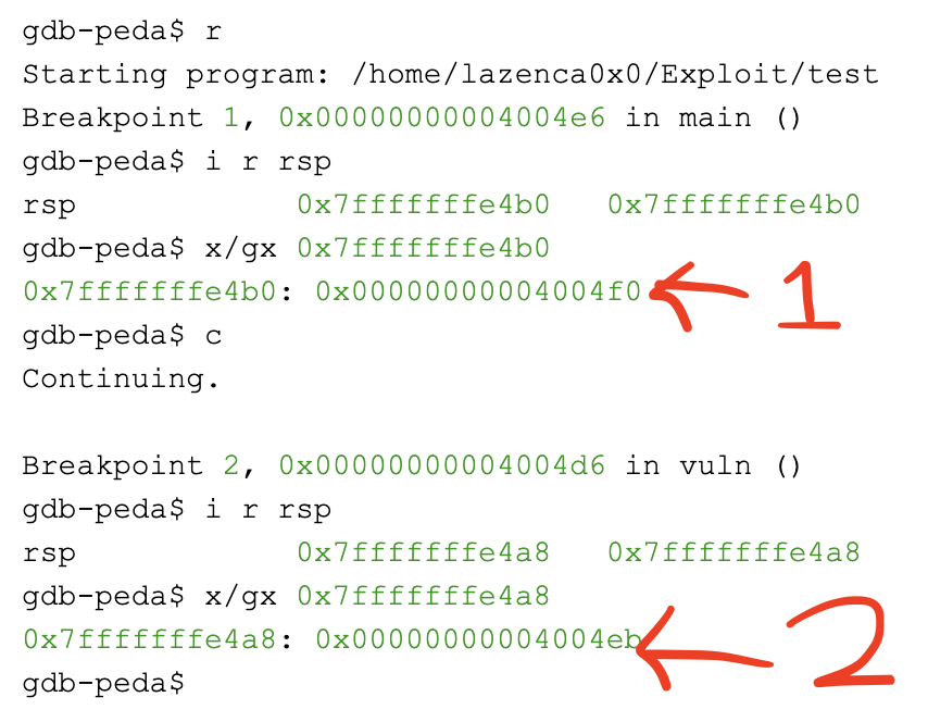 각각 vuln() 함수의 첫번째 명령어, read() 함수 호출, vuln() 함수의 ret 명령어 부분이다.