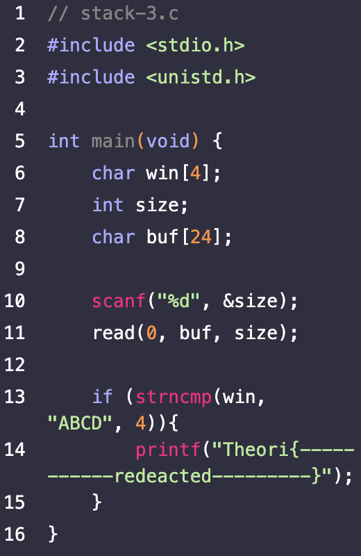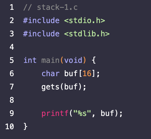 16바이트 크기의 버퍼 buf를 스택에 할당하고, 사용자로부터 gets()를 이용하여 입력받는다. 이때 gets함수는 사용자가 개행을 입력하기 전까지 입력했던 모든 내용을 첫 번째 인자로 전달된 버퍼에 저장하는 함수이므로!!! 사용자가 16바이트가 넘는 데이터를 입력해버리면, 스택 버퍼 오버플로우가 발생한다.