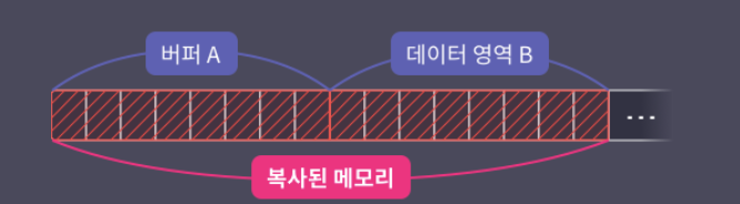 버퍼 A에 16바이트 크기의 데이터를 복사한다면 버퍼 A를 채우고 남은 8바이트의 데이터는 그 뒤의 영역인 버퍼 B에 쓰여지게 된다.
