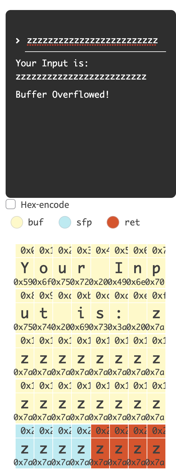 buf 의 메모리 앞에 이미 추가된 Your Input is 문자열을 고려해 데이터를 넣어보면 스택 버퍼 오버플로우가 발생했음을 알 수 있당.