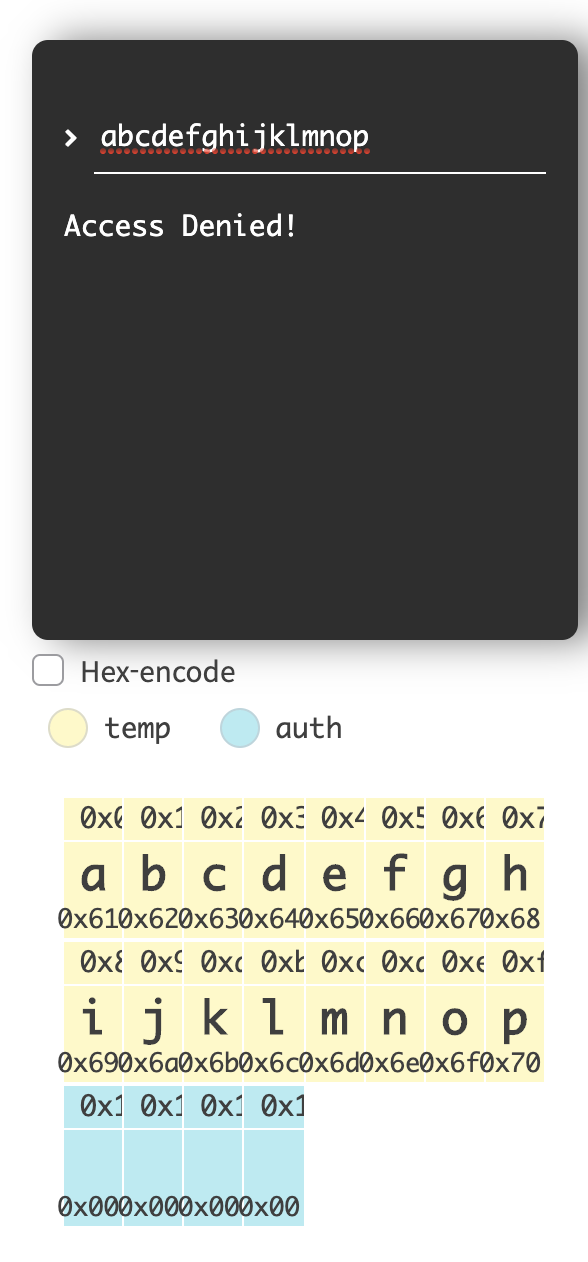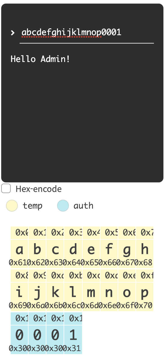 스택 오버플로우를 이용해 auth의 영역에 0이 아닌 값을 입력해준다면 line24의 if 문은 항상 참을 반환하게 되면서 "Hello Admin!"이 출력되는 것을 볼 수 있다.