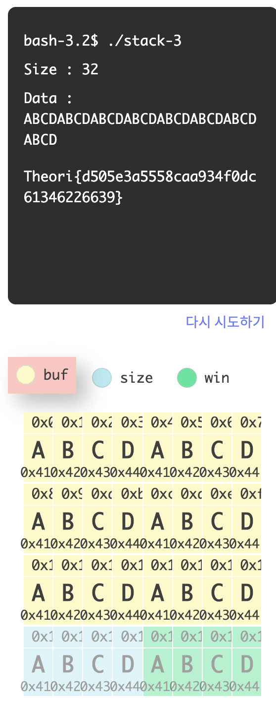 메모리 상에는 buf, size, win 순서로 할당되어 있으니, buf 버프를 채우는데 24바이트, size를 채우는데 4 바이트, win을 채우는데 4 바이트가 필요하기에 32바이트를 입력하겠다고 하고, 29번째부터 32번째까지 "ABCD"를 넣어주면 win 버퍼에 "ABCD"가 저장되며 line 13의 if문에서 참을 반환하게 된당.