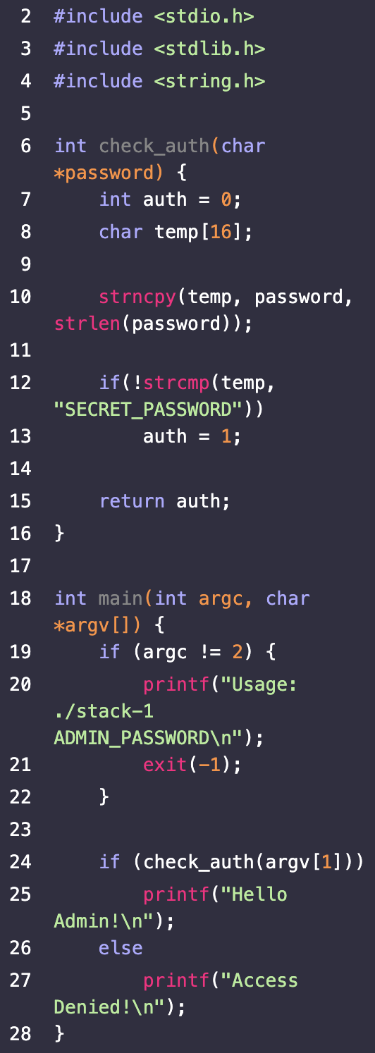 스택 메모리 상태를 살펴보면 temp 버퍼 뒤에 바로 이어서 auth 값이 존재할 것이므로, temp에 복사를 진행할때 스택 오버플로우가 발생한다면? auth에 데이터가 침범을 하고, 이 값이 0이 아닌 데이터라면 실제 인증 여부와는 상관없이 line 24의 if 문은 항상 참!