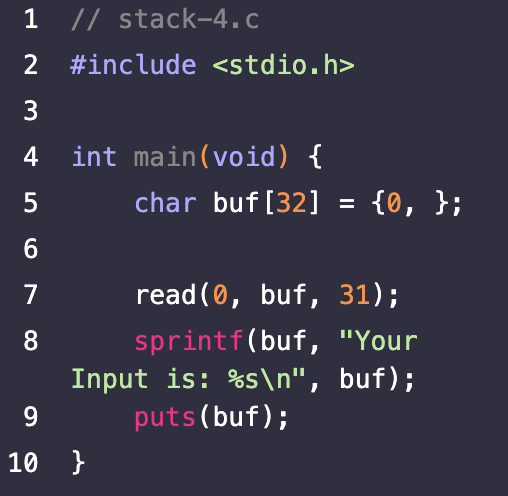 sprintf 함수를 통해 버퍼에 값을 쓸때는 두번째 인자로 주어진 "Your Input is: "가 앞에 붙는다는 사실을 주의!!