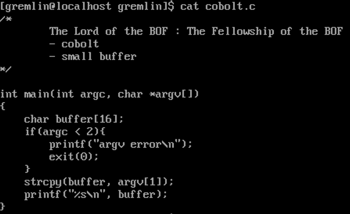 간단한 코드다. 256 바이트 크기의 buffer를 선언하고 argc가 2보다 작다면 "argv error"를 출력하고 프로그램을 종료한다.