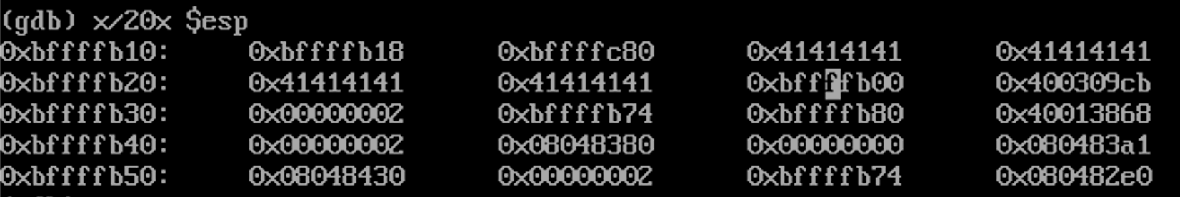 x/20x $esp로 esp의 상황을 보면? 저기 아름다운 414141414141414144141414141이 실행할때 같이 입력한 AAAAAAA가 된다.