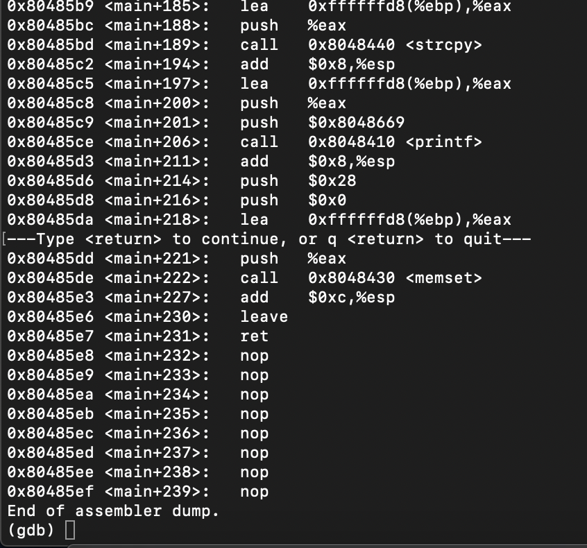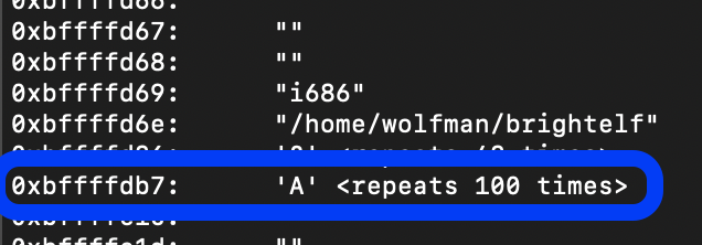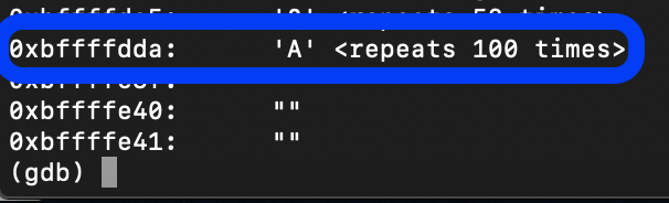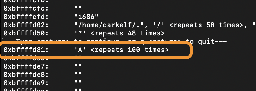 어떤 이유에서 200, 41로 나눠서 들어가지는 모르겠지만 암튼 argv[2]로 줬던 "A"가 241바이트만큼 0xbffffb9e에 들어가있다.