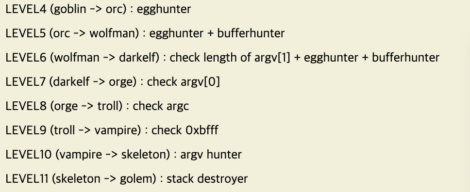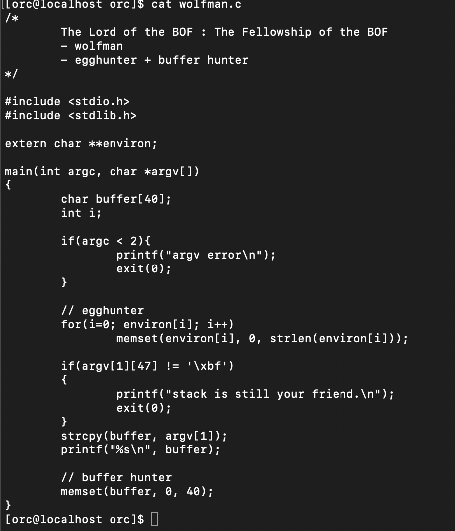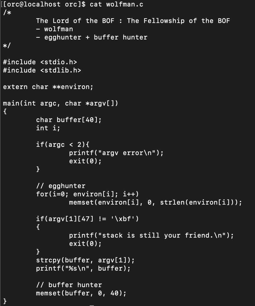 goblin->orc 와 orc->wolfman 의 차이점은 buffer hunter, 즉 선언된 buffer 40바이트를 사용하지 못한다는 것이다.