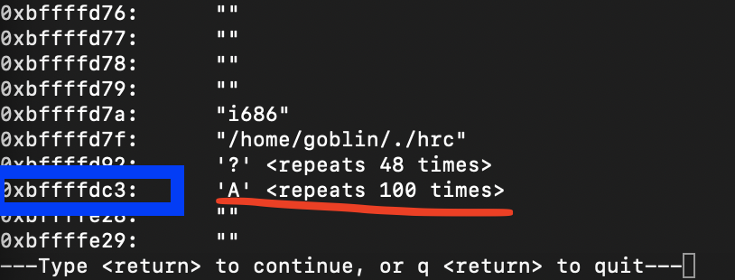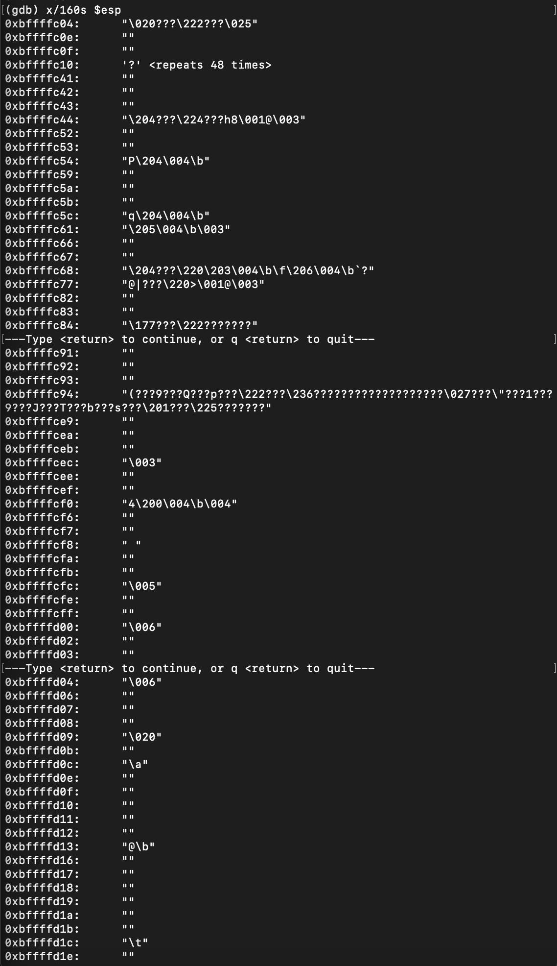 x/160s $esp로 argv[2]에 들어갔을 A를 찾음으로써! argv[2]의 첫 주소값인 0xbffffd81을 찾아냈다.