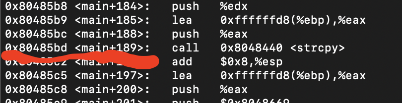 main+189에서 strcpy를 호출하기 때문에 main+201 정도에 BP를 걸어 argv[2]의 주소값을 알아내보겠다!!