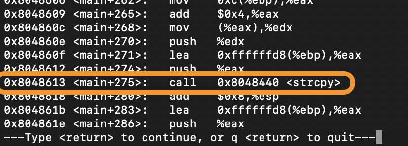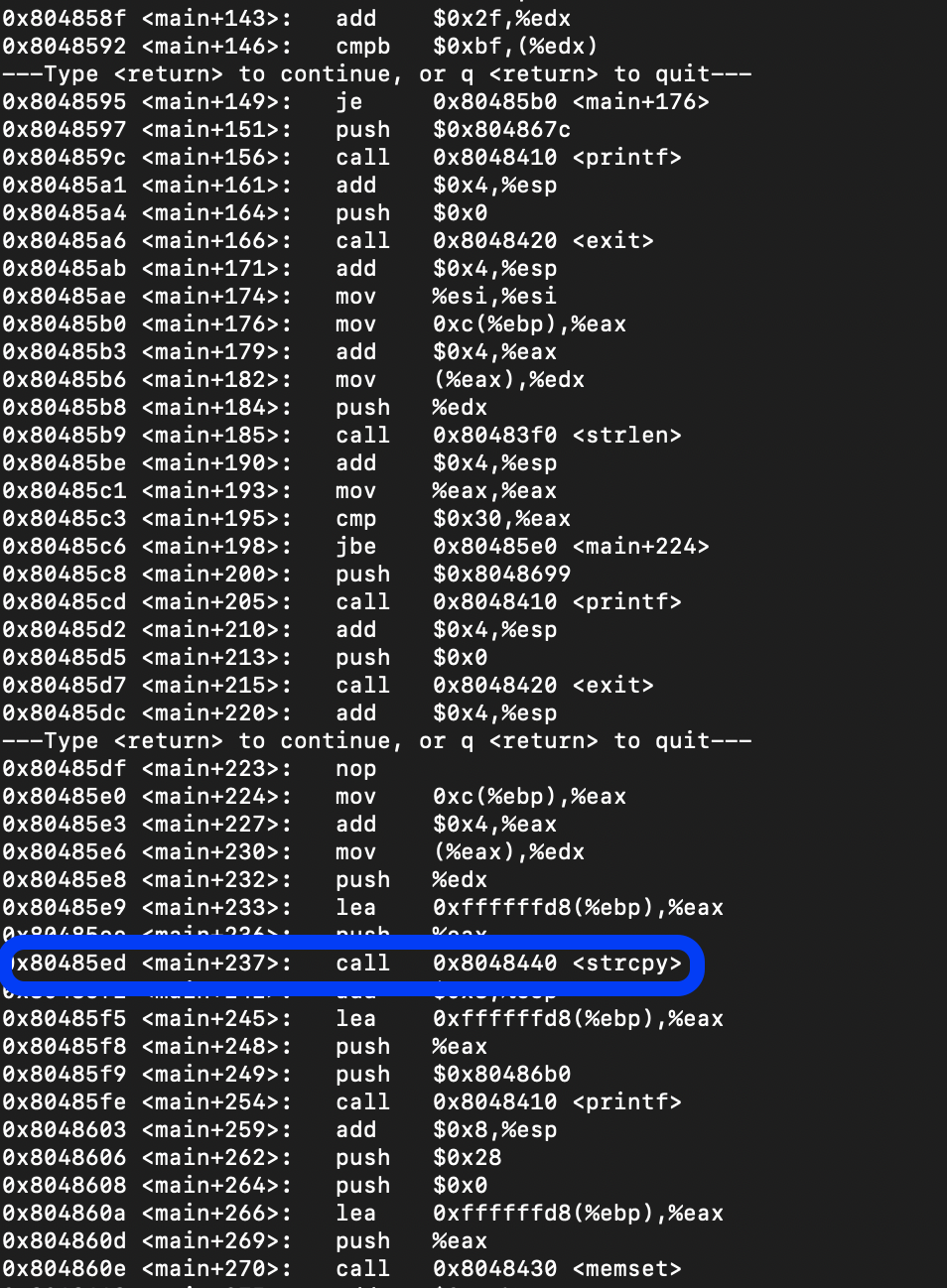 strcpy 함수가 호출되는 main+237에 BP를 걸어서 아까와 똑같이 진행해보자