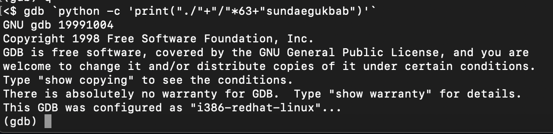 gdb sundaegukbab이 아닌 gdb `python -c 'print("./"+"/"63*+"sundaegukbab")'`로 진행해보자