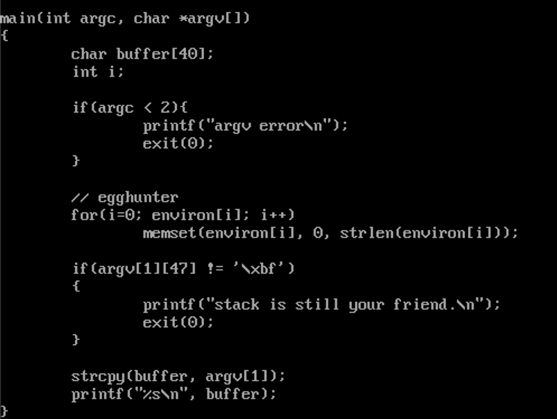 buffer(40바이트)와 i(4바이트)를 각각 선언하고 저번 단계와 같은 egghunter를 거쳐 strcpy까지 진행한다.
