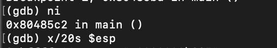 설정해놓은 BP에 걸렸다. ni를 입력해 strcy 함수를 수행시키고 x/20s $esp를 입력해 스택의 상황을 살펴보도록 하자