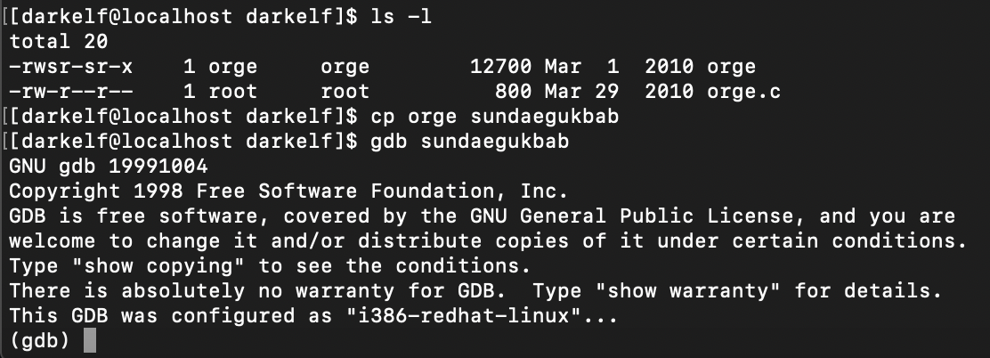 근데 gdb로 분석할려고 만든 파일 이름이 sundaegukbab이다 보니깐 원래 파일인 orge와 프로그램 이름의 길이에 차이가 생긴다.