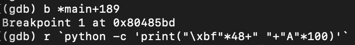 "\xbf" * 52바이트( buffer + i + EBP + ReturnAddress) 와 "A" * 100이다.