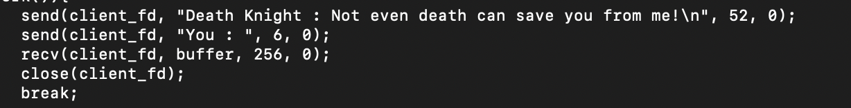 send(client_fd, "Death Knight : Not even death can save you from me!\n", 52, 0);